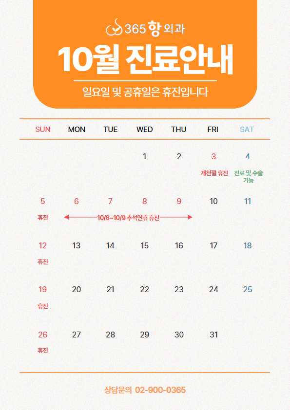 페이지 정보 작성자 365항외과 댓글 0건 조회 46회 작성일 25-09-24 10:58 목록 본문 안녕하세요, 365항외과 2025년 10월 진료시간 안내입니다.내원시 참고하시기를 당부드립니다. 정확하고 세심한 진료로써 최선을 다하겠습니다. 감사합니다. 다음글365항외과 2025년 9월 진료시간 안내입니다. 25.08.28